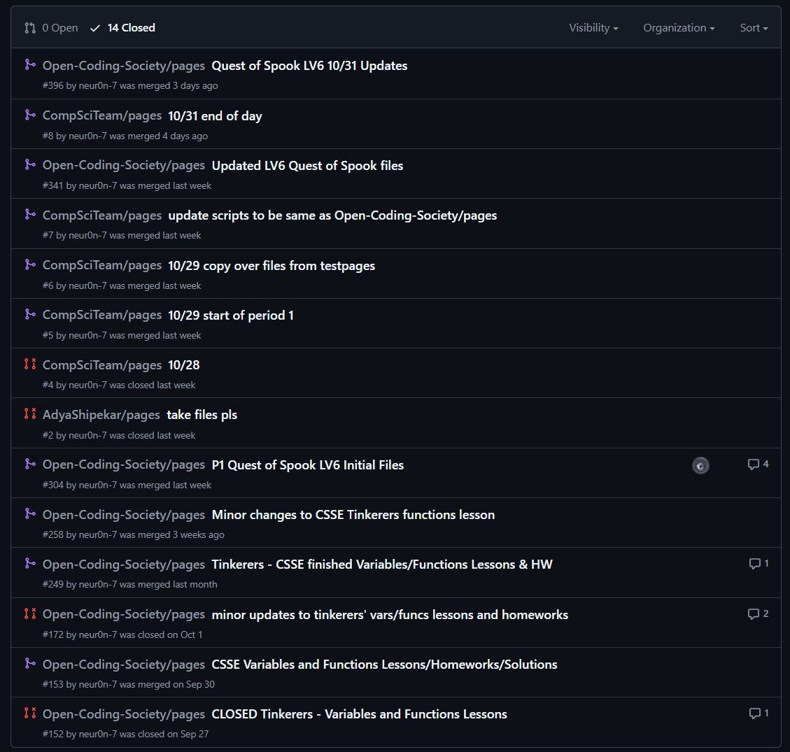 I have made 14 pull requests, 8 of which were to Open-Coding-Society/pages. Here is an image of my pull requests throughout CSSE 1: