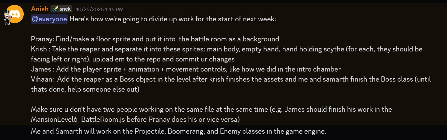 I helped contribute to the project as I was the Scrum Master for our team. I worked with my team to make the additions to the game engine (Boss.js, Boomerang.js, FightingPlayer.js, Projectile.js) that enabled the Reaper to work properly with its unique mechanics.